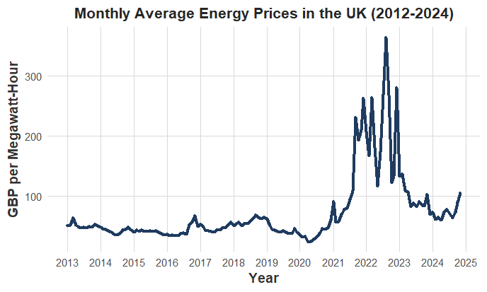 Figure 4 shows the volatility of energy prices in the UK from 2013-2025. Energy prices remained relatively stable, until skyrocketing from 2021-2023 and then coming down. However, upon closer inspection, the numbers show that energy prices in 2025 are now over twice what they were in 2020 and are continuing to grow. Such growth in energy prices, more than doubling in 4 years, increased firm operating costs and a reduction in consumer spending. Due to higher energy costs, most sectors, including services, will decrease operating hours and hire less, leading to a lower productivity spiral. On a macro level, lower productivity within firms will lead to a higher GDP-Debt burden for the UK. High energy volatility and rising prices expose the economy to supply shocks, and the ever-looming threats of tariffs can impact the UK economy more. Greater exposure to supply shocks can complicate monetary policy: what part of inflation is due to supply shocks?