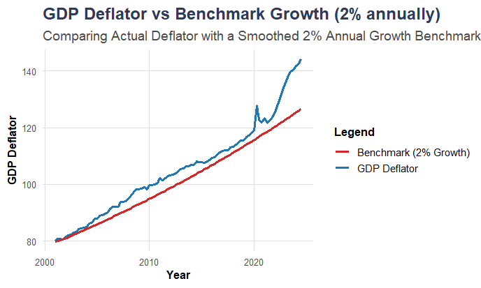 The figure shows that the rise in the price level has remained steadily above the targeted 2% growth, before completely deviating after 2022. If GDP per capita stagnates while inflation rises at this rate, real incomes fall, meaning consumers can afford less despite overall GDP growth. Such figures are rarely observed, but it is crucial for understanding why people feel worse off even when headlines show GDP growing.