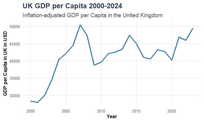 The UK economy has shown massive resiliency in the face of a multitude of negative economic shocks over the last decade and a half, with the UK economy growing and GDP figures showing an upward trend. However, despite showing strong GDP growth, when accounting for population growth, the numbers show a different story. Below, adjusted GDP per Capita for the UK from 2000-2024 is plotted.