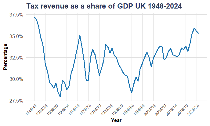 Figure 4 shows how tax revenue has risen to levels not seen since the end of WW2. A few reasons can help explain the rise of Tax Revenue as a share of GDP since the early 1990s, particularly due to tax rates increasing, income distribution changes, and growth in sectors that are highly taxed (e.g. finance due to London’s booming Canary Wharf.)