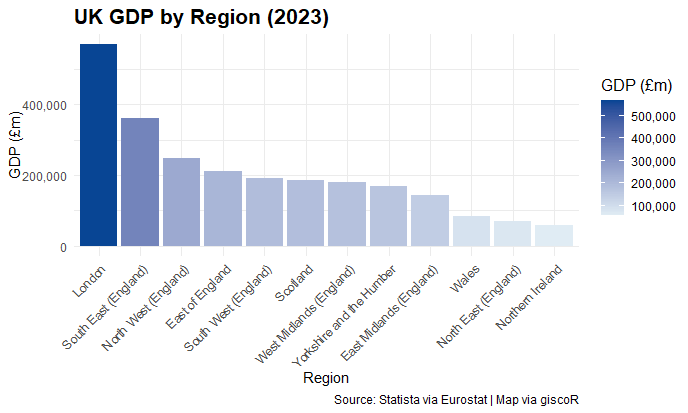 In an environment of weak aggregate demand, the few regions that experience higher levels of productivity exacerbate regional inequality. Firms will tailor their business services to the needs of the more productive region, while skilled workers will emigrate from low productive regions to higher productive regions. Such agglomeration of productivity and high skilled workers will push the productive region forward, while other regions experience “brain drain” and lag behind. Figure 3 highlights the stark regional inequality within the UK. London, a well-known international hub of the world’s top talent, by far is the greatest regional economy, but other regions dominated by the metropolitan domestic hubs of Manchester and Birmingham don’t even measure half of London’s capacity (the Southeast Region of the UK may be experiencing spillover effects from London’s economy.)