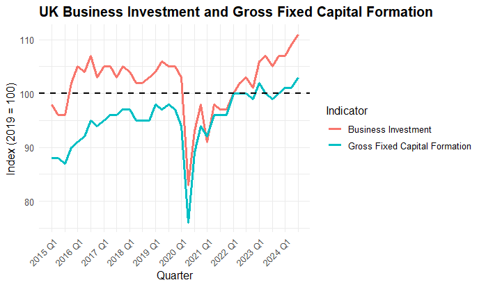 Figure 2 shows low business and capital formation investment experienced in the UK economy over a span of 9 years. Despite the volatility induced by the Covid-19 pandemic, business investment has been stagnant for almost a decade while gross fixed capital formation has lagged. Business investment only surpassed its 2016 level in 2023 and overall growth from the time period has been near-zero. When firms realize that the economy is in a state of low growth and the targeted client base has weak demand for their services, they have little incentive to invest and build up future production capacity. In such a manner, weak internal demand translates into low investment and low productivity. If the tides change and the economy is able to finally expand and escape the low growth trap, firms do not have the production capacity to capitalize in the now-booming economy and expand their operations.