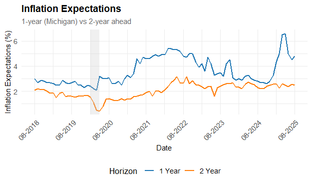 1 year inflation expectations remained volatile and above the 2% target, while 2-year inflation expectations remained anchored closer to the 2% target following the 2020-2022 inflation surge. The discrepancy shows that inflation expectations reflected transitory inflation expectations, with inflation surging before moderation in the 2-year horizon. After the announcement of the Liberation Day tariff policies, 1 year consumer inflation expectations jumped to nearly 6%. However, 2-year inflation expectations remained low and stable, close to the 2% mark. Gorodnichenko and Coibion (2025) remark that shocks to short-run inflation expectations are typically long lived and can exert a pronounced effect on long-run expectations. When it comes to actual price-setting behavior, expectations established over the short-term horizon matter more than long term inflation expectations. Firms adjust prices on the near term inflation outlook until their next price adjustment and given that U.S. firms tend to revise prices at least annually (Bils and Klenow, 2004; Nakamura and Steinsson, 2008), it is the near-term inflation trajectory which shapes their immediate responses to cost pressures and demand conditions.