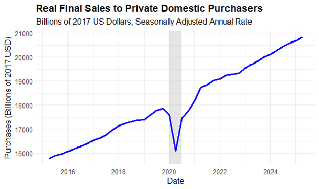 First, to analyze spending within the US economy, I use real final sales to private domestic purchasers to measure inflation adjusted spending by US households and businesses. Figure 1 depicts real final sales to private domestic purchasers from Q2 2015 to Q2 2025, chained in billions of 2017 US dollars and seasonally adjusted.