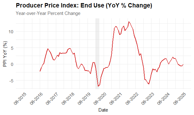 From late 2019 through mid-2021, core goods inflation rose sharply due to supply chain disruptions, inventory shortages, and elevated demand. The short-lived rise quickly moderated. Surprisingly, after Trump’s liberation day announcement, core goods inflation has been slow to rise. Figure 4 illustrates the Produce Price Index, which captures inflation from the seller’s side and is often seen as indicative of future price movements.